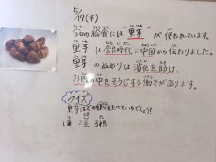 5月17日(木)、今日の給食には「里芋」が使われています。里芋は奈良時代に中国から伝わりました。里芋のぬめりは消化を助け、お腹の中をそうじする働きがあります。
