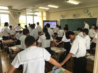 8年生理科の学習のようすです。今日は神経の伝達について学習しました。脳からの命令がどのように各部に伝わっていくのか、理解を促すために写真のような実験を行いました。友だちと手をつなぎ、手を握り合います。握られたら、次の人の手を握る。一人目が手を握ってから、何秒後に最後の人の手が握られるのか、その時間を計測しました。生徒たちも楽しみながら学習に励んでいました。