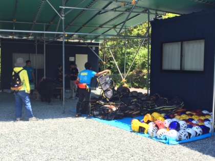 ラフティングのためのダイビングスーツとライフジャケットに着替えます。