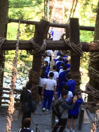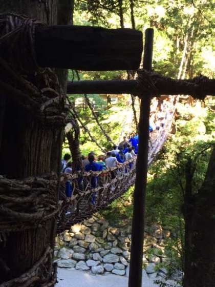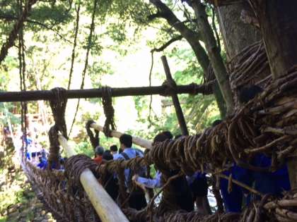 祖谷のかずら橋を渡りました。渓谷が足元から見え、スリル満点です。これから、今日の宿舎に向かいます。