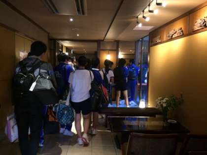 ほぼ予定通りに、今日の宿舎のこんぴら温泉郷 ホテル八千代に到着しました。すぐに部屋に入り、6時20分には、大広間に移動します。ここで、入館式と夕食です。