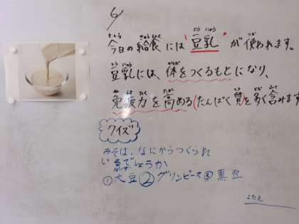 6月4日(月)、今日の給食には「豆乳」が使われています。豆乳は、体をつくるもとになり、免疫力を高める[たんぱく質]を多く含みます。