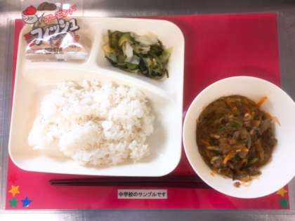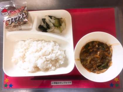今日の給食は、小中ともに【マーボーはるさめ、ミックス海そうのサラダ、アーモンドフィッシュ、ご飯、牛乳】です。