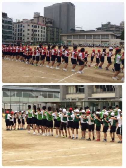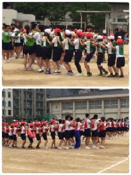 今年度の「いまスポ」では、1年生から9年生までの全校児童・生徒が全員で「ジェンカ」を踊ります。これまでは、団ごとに練習してきました。今日はじめて、全員がそろって、運動場いっぱいに「ジェンカ」の輪を作りました。