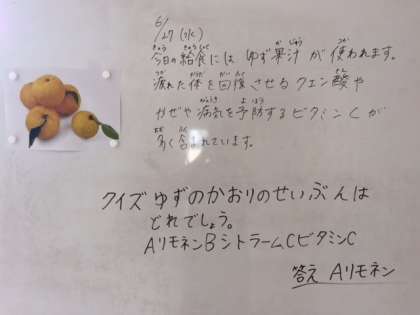 6月27日(水)、今日の給食には、ゆず果汁が使われています。疲れた体を回復させるクエン酸やかぜや病気を予防するビタミンCが多く含まれています。