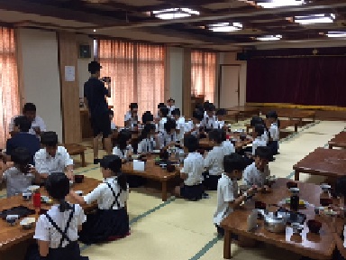 お昼ご飯です。メニューはかやくごはんです。長距離の移動でお腹がペコペコの子どもたちは、ほとんどの子が2杯3杯とおかわりしています。それ以上のおかわりの子も!