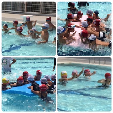 7月26日(木)、低学年のプール開放の様子です。2つのチームに分かれて、ボードをバタ足の力で押していきました。バタ足にも思わず力が入ります。楽しみながらバタ足の練習になっているようです。