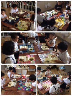 1年1組の給食の様子です。2学期から牛乳が、ビンから紙パックに変わっています。その評判は・・・。「なめらかで、おいしい!」と好評でした。牛乳がこぼれないように、やさしく紙パックをもって飲んでいました。ちなみに、今日の献立にある「ミニフィッシュ」も大人気で、「香ばしくておいしい」と喜んで食べていました。