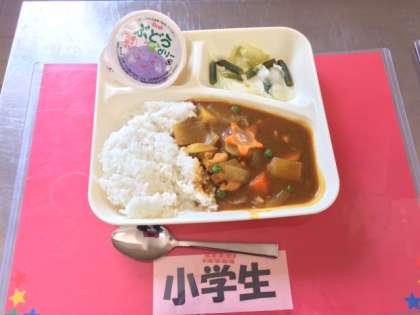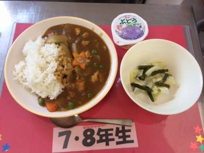 今日の給食は、小中ともに【チキンカレーライス、野菜のピクルス、ぶどうゼリー、牛乳】です。