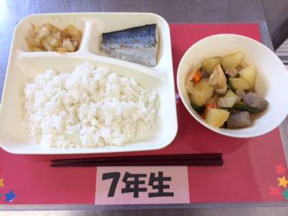 今日の給食は、小中ともに【さごしの塩焼き、じゃがいもと一口がんもの煮もの、キャベツのおひたし、ご飯、牛乳】です。