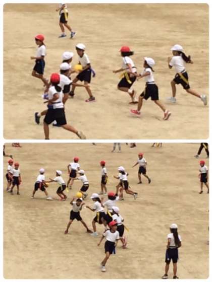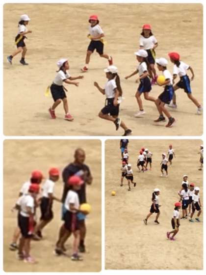 それぞれのクラスが、4色に分かれてチーム分けをし、タグラグビーに取り組んでいました。