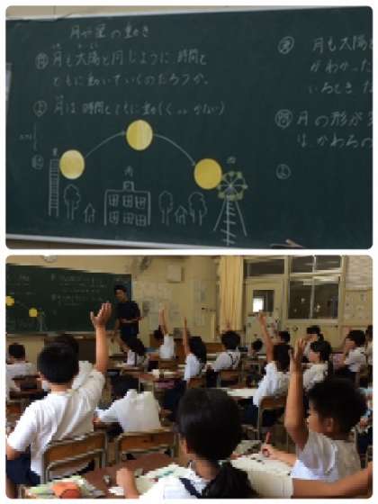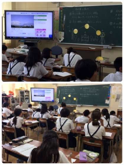 4年1組の理科の時間の様子です。単元「月や星の動き」の学習をしていました。まずは、課題を各自で考え、その後、みんなで一緒に考えるという順番で学習が進んでいきました。
