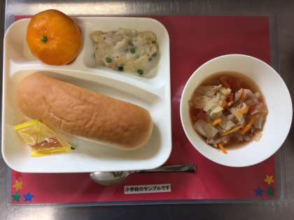 今日の給食は、小中ともに【豆乳マカロニグラタン、トマトスープ、冷凍みかん、コッペパン、アプリコットジャム、牛乳】です。
