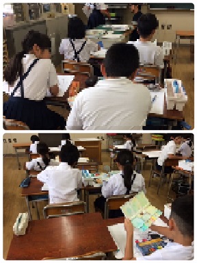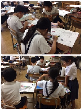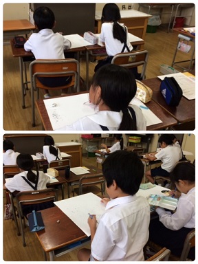 4年2組の図工の時間の様子です。「夏休みの思い出」を題材に絵を描いていました。出来上がりが楽しみです。