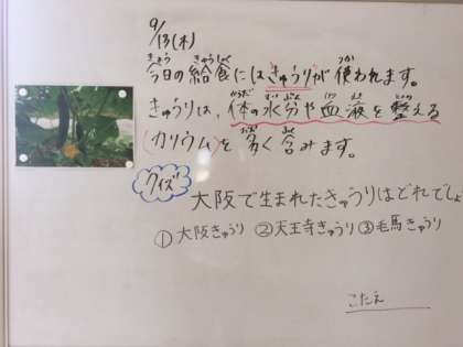 9月13日(木)、今日の給食には「きゅうり」が使われます。きゅうりは、体の水分や血液を整える[カリウム]を多く含みます。