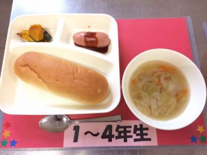 今日の給食は、小中ともに【おさつパン、フランクフルトのケチャップソース、スープ、焼きかぼちゃ、牛乳】です。