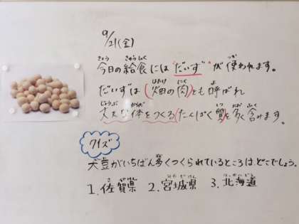 9月21日(金)、今日の給食には「だいず」が使われます。だいずは、[畑の肉]とも呼ばれ、丈夫な体をつくる[たんぱく質]を多く含みます。