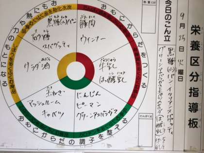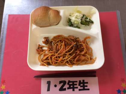 今日の給食は、小学生は【黒糖パン、イタリアンスパゲッティ、グリーンアスパラガスとキャベツのサラダ、牛乳】、中学生は【発酵乳】が加わります。