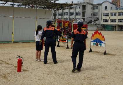 今回、皆さんには水消火器、可搬式ポンプ、三角筋の使い方などいろいろな体験をしてもらいました。