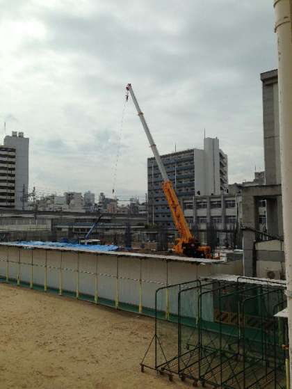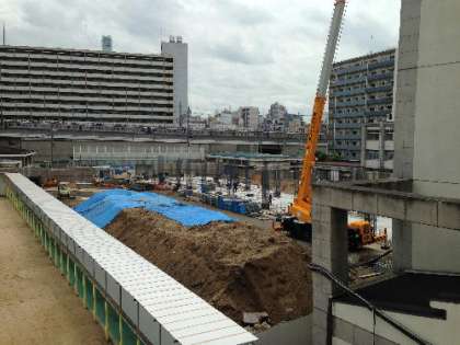 8日の工事は、昨日からの柱の鉄筋作業に続いて、重機が持ち込まれ、その次の準備に入っているようです。
