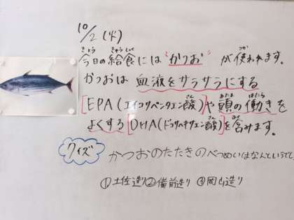10月2日(火)、今日の給食には「かつお」が使われます。かつおは、血液をサラサラにする[EPA(エイコサペンタエン酸)]や頭の働きをよくする[DHA(ドコサヘキサエン酸)]を含みます。
