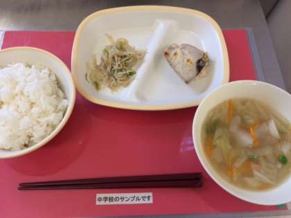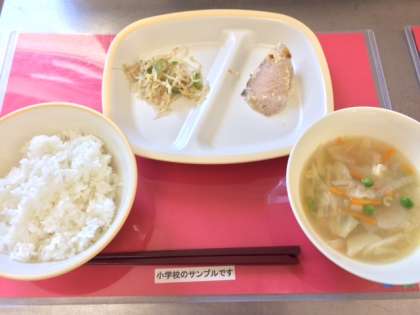 今日の給食は、小中ともに【ご飯、かつおのマリネ焼き、牛乳、マカロニとキャベツのスープ、もやしとピーマンのソテー】です。