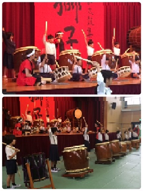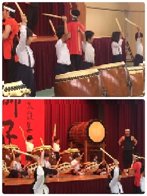 体験する児童を交代して・・・。みんな、和太鼓を経験できるのが、とてもうれしそうです。