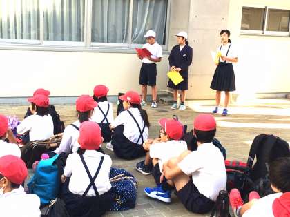代表児童の進行で出発式をしました。早朝にもかかわらず、たくさんの保護者の皆様にお見送りいただき、ありがとうございます。