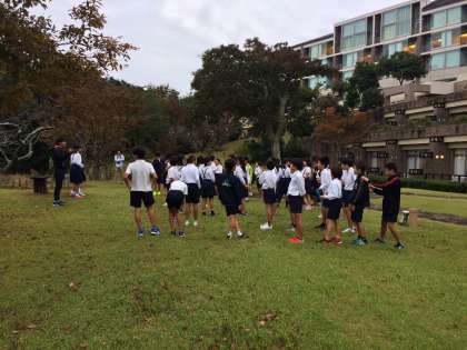 簡単なレクレーションをしています。反対抗伝言ゲームです。背中に指で言葉を伝えていきます。