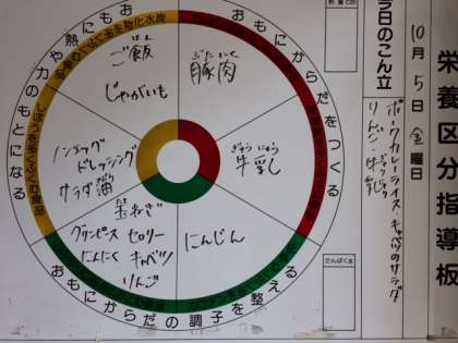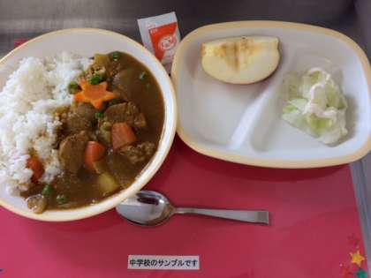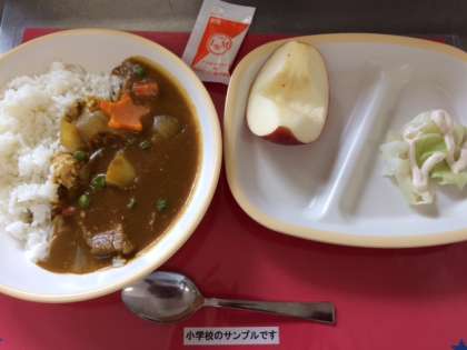 今日の給食は、小中ともに【ポークカレーライス、キャベツのサラダ、りんご、牛乳】です。