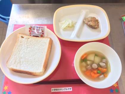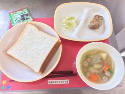今日の給食は、小学生は【鶏肉の香草焼き、スープ煮、サワーキャベツ、食パン、いちごジャム、牛乳】、中学生は【ソフト黒豆】が加わります。