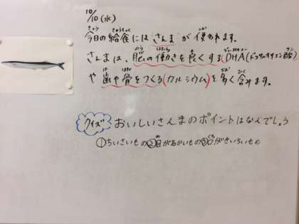 10月10日(水)、今日の給食には「さんま」が使われます。さんまは、脳の働きを良くする[DHA(ドコサハキサエン酸)]や骨や歯をつくる[カルシウム]を多く含みます。