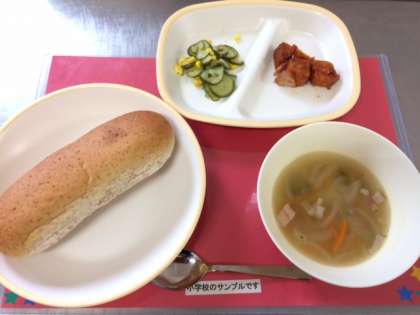 今日も中学生は中間テストのため、小学生のみになります。今日の献立は、【ライ麦パン、まぐろのオーロラ煮、スープ、きゅうりとコーンのゆずドレッシング、牛乳】です。