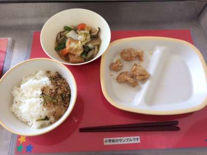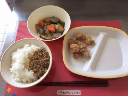 今日の給食は、小中ともに【鶏肉のたつたあげ、あつあげと野菜の煮もの、おかか菜っ葉、ご飯、牛乳】です。