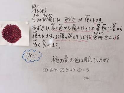 10月18日(木)、今日の給食には「あずき」が使われます。あずきは、赤い色から魔よけとして「赤飯」に昔から使われます。お腹の中をそうじする[食物せんい]を多く含みます。