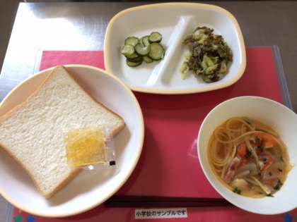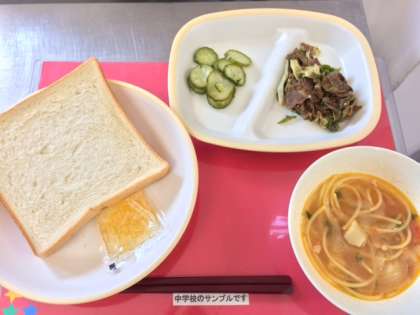 今日の給食は、小中ともに【牛肉のカレー風味焼き、トマトのスープスパゲッティ、きゅうりのサラダ、食パン、マーマレード、牛乳】です。