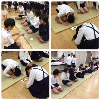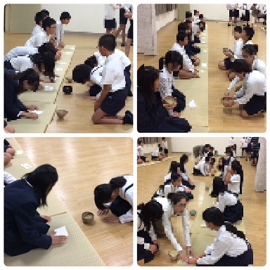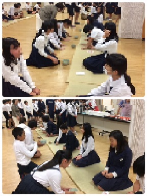 1組と2組が交代で、おもてなし側とお客さんになって「お茶体験」を進めました。慣れない正座に少し苦労しながら、そして、1つ1つの作法を確かめながら体験を進めていっていました。少し緊張している様子も・・・。