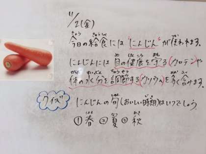 11月2日(金)、今日の給食には「にんじん」が使われます。にんじんには、目の健康を守る[カロテン]や体の水分を調節する[カリウム]を多く含みます。