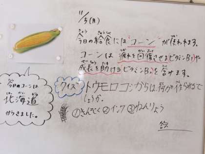 11月5日(月)、今日の給食には「コーン」が使われます。コーンは、疲れを回復させる[ビタミンB1]や成長を助ける[ビタミンB2]を多く含みます。