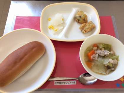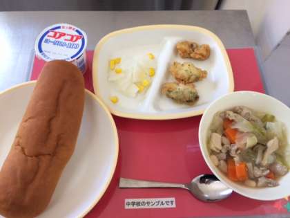 今日の給食は、小学生は【黒糖パン、白身魚のフリッター、スープ煮、だいこんのピクルス、牛乳】、中学生は【ヨーグルト】が加わります。