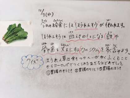 11月7日(水)、今日の給食には「ほうれん草」が使われます。ほうれんそうは、血液のもとになる[鉄]や骨や歯を丈夫にする[カリウム]を多く含みます。