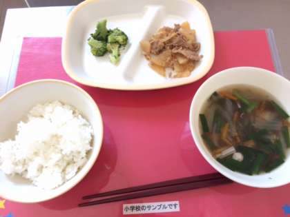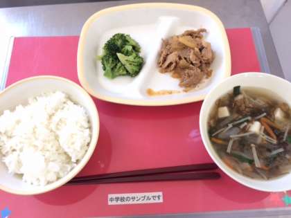 今日の給食は、小中ともに【ご飯、豚肉のコチジャンいため、牛乳、もずくのスープ、ブロッコリーのナムル風あんもの】です。