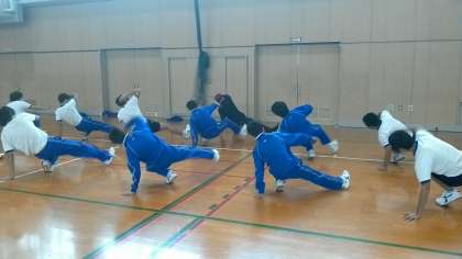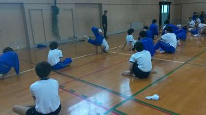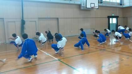 ダンス出前授業の3回目(実技の2回目)です。職場体験で1週間ぶりの授業でしたが、少しの復習で思い出せていました。今日の授業では、フロアーを使ってのパワームーブやチェアーに挑戦しました。腕の力やバランスが大切な技です。