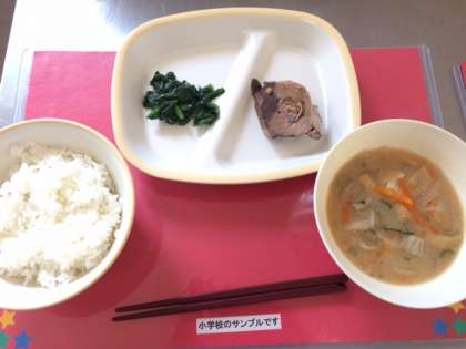 今日の給食は、小中ともに【なまりぶしのしょうが煮、みそ汁、ほうれん草のごまあえ、ご飯、牛乳】です。