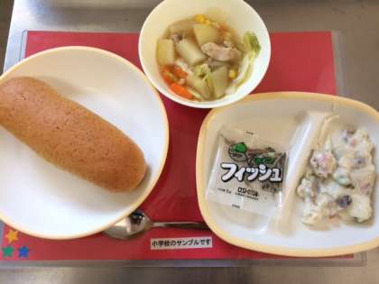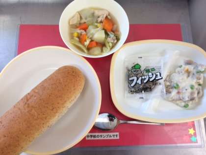 今日の給食は、小中ともに【ライ麦パン、鶏肉とじゃがいものスープ煮、きのこのドリア、ミニフィッシュ、牛乳】です。