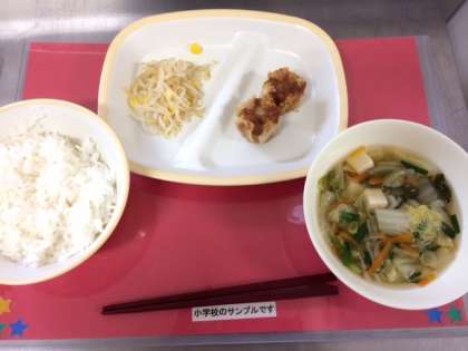 今日の給食は、小中ともに【ご飯、あげシュウマイ、えびととうふのスープ、もやしとコーンのピリ辛あえ、牛乳】です。