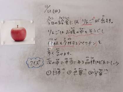 12月12日(水)、今日の給食には「りんご」が出ます。りんごは、お腹の中をそうじし、便秘を予防する[ペクチン]を多く含みます。