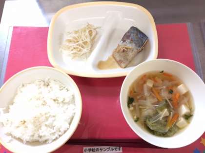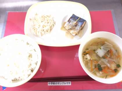 今日の給食は、小中ともに【ご飯、さばのみそ煮、五目汁、もやしの甘酢あえ、牛乳】です。