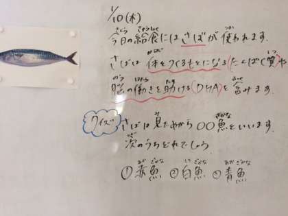 1月10日(木)、今日の給食には「さば」が使われます。さばは、体をつくるもとになる[たんぱく質]や脳の働きを助ける[DHA]を含みます。