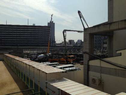 いよいよ1階部分にコンクリートを流し込む日が来たようです。朝からミキサー車などがやってきて準備を進めています。